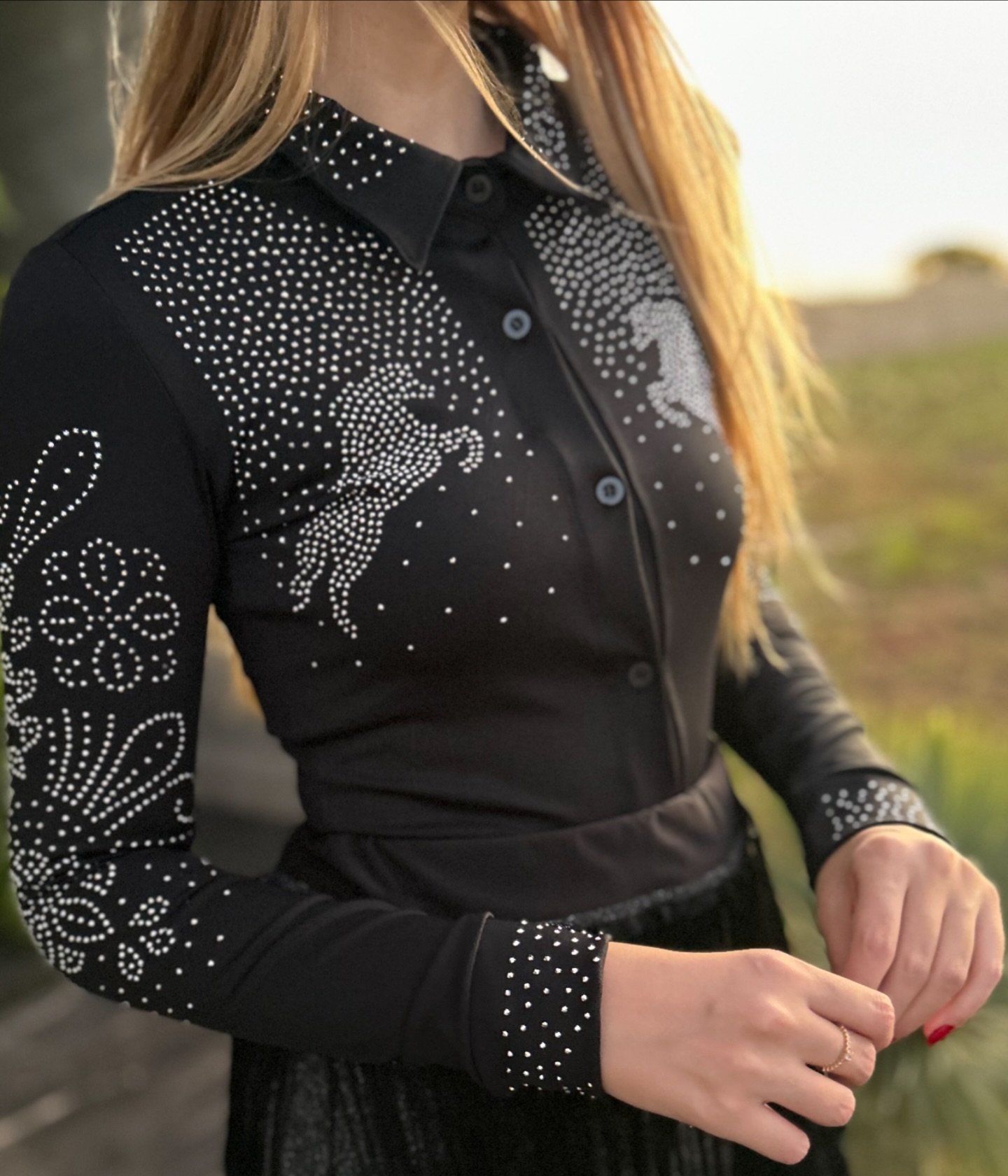 BODY FEMININO CAMISA CAVALO BRILHO STRASS