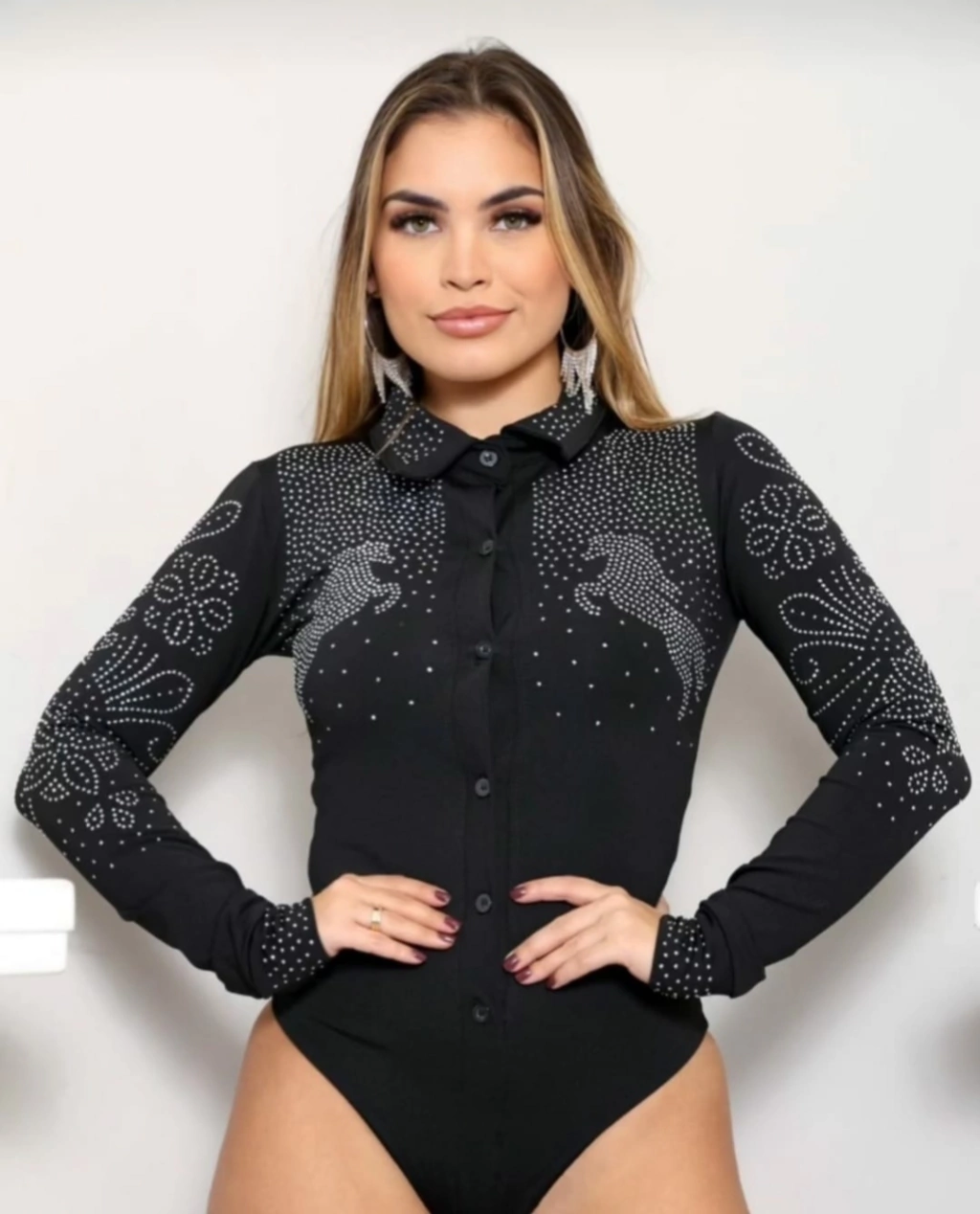 O body manga longa com botões na frente e aplicação de strass é a definição de elegância e sofisticação. Com uma golinha delicada, esta peça é perfeita para ocasiões que exigem um toque especial.
