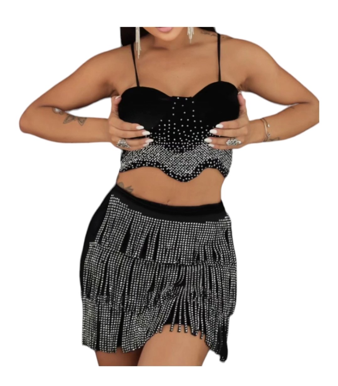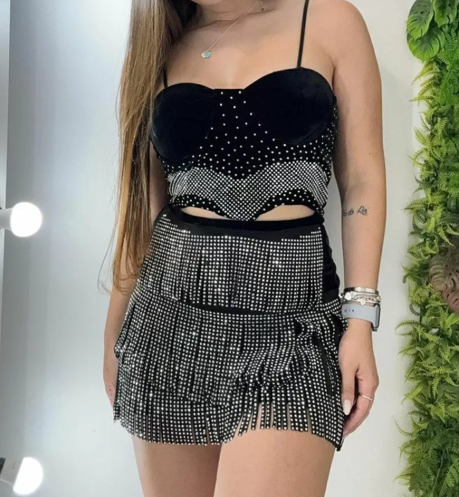 A saia, confeccionada em tecido de veludo, possui franjas com strass que adicionam um charme especial ao look. Este conjunto é ideal para ocasiões que pedem um visual deslumbrante e cheio de personalidade.