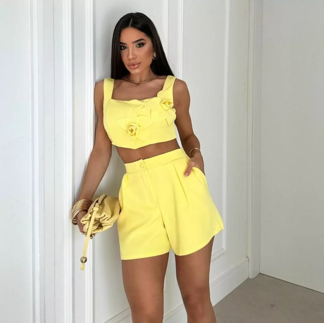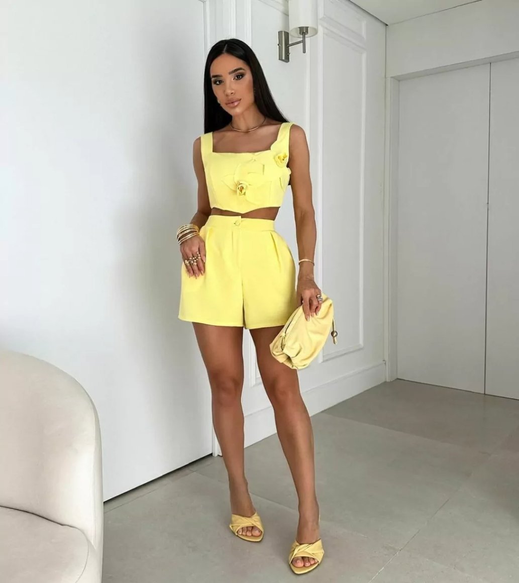 Eleve seu estilo com este elegante conjunto de alfaiataria branco, perfeito para ocasiões em que a sofisticação é essencial. Com um corte impecável, o top apresenta delicadas aplicações florais em 3D que trazem um charme especial e diferenciado à peça. O short de cintura alta complementa o look com um ajuste confortável e moderno, valorizando a silhueta. Confeccionado com materiais de alta qualidade, este conjunto é ideal para eventos formais, encontros ou ocasiões onde o requinte é indispensável. Tamanho único, veste confortavelmente do 38 ao 42. A escolha ideal para quem busca aliar classe e versatilidade em um só look.