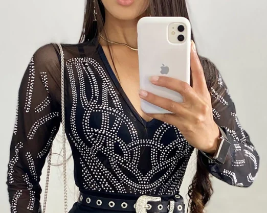 Estamos animados em apresentar a nossa mais recente novidade na loja: o conjunto body manga longa tule com aplicações de strass e saia com franja. Este conjunto é perfeito para quem busca um look elegante e moderno.