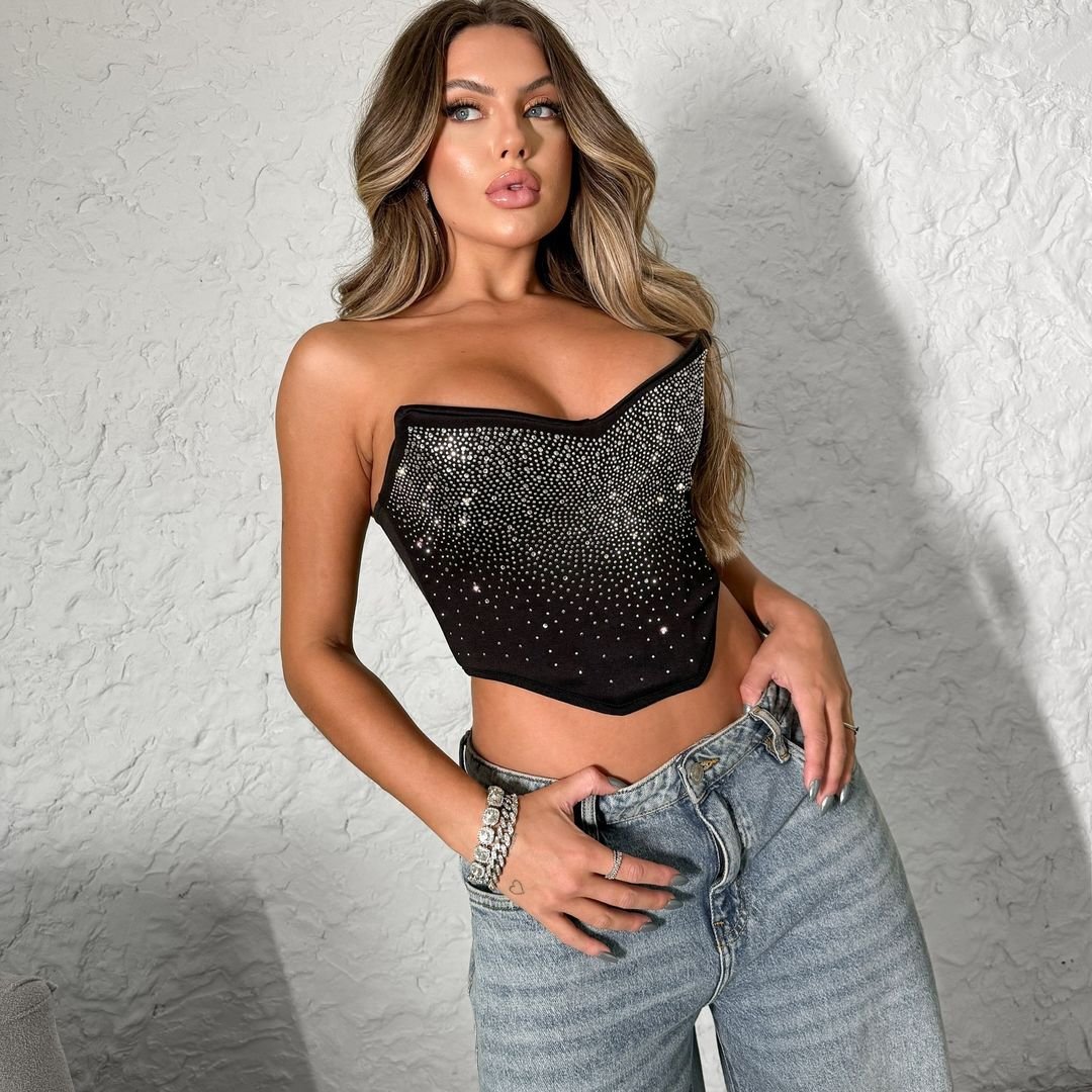 O corselet cropped combina sensualidade e classe com seu corte justo e recortado que realça as curvas de forma graciosa. Feito em neoprene com aplicações em strass e sem bojo, a peça transmite confiança e estilo, revelando uma parte elegante da área abdominal.