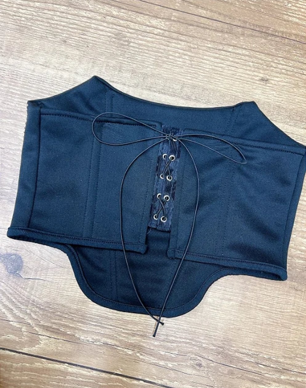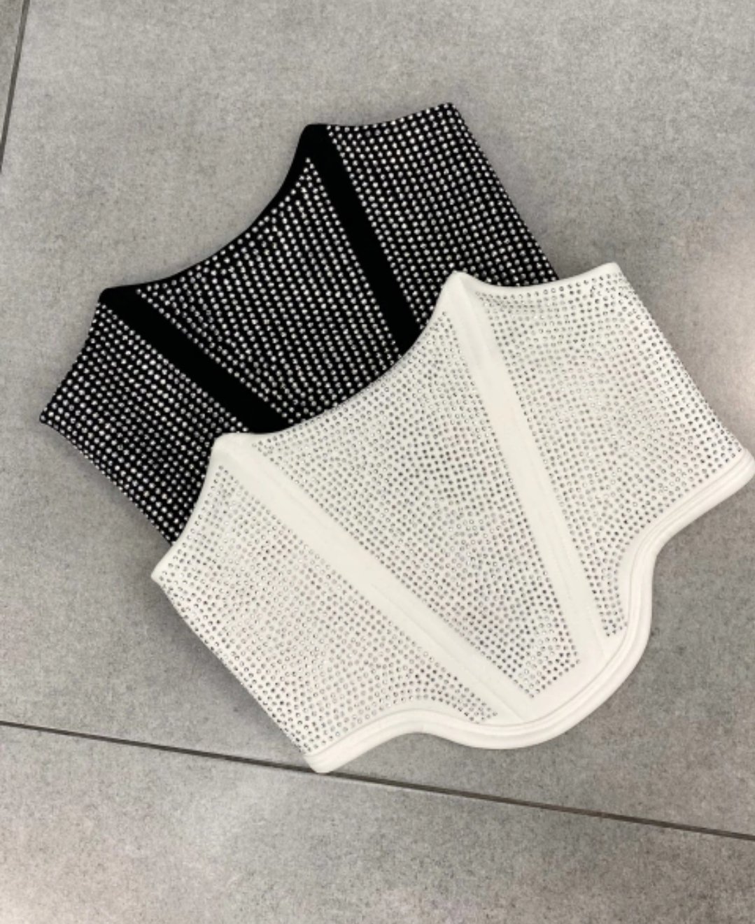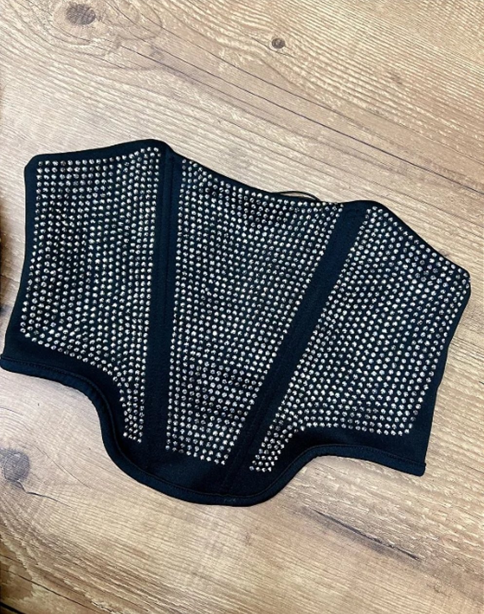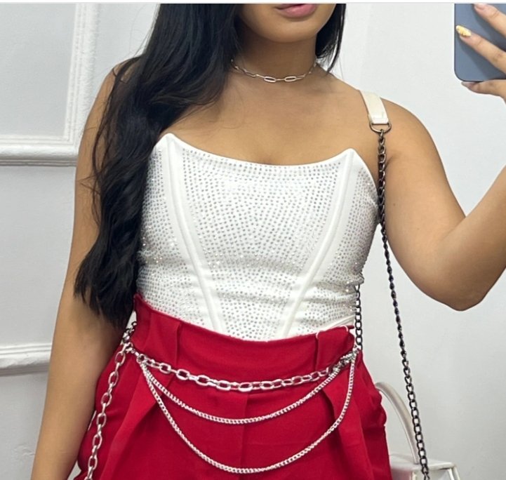Cropped corselet tomara que caia com amarração, possui barbatana e brilho frontal.