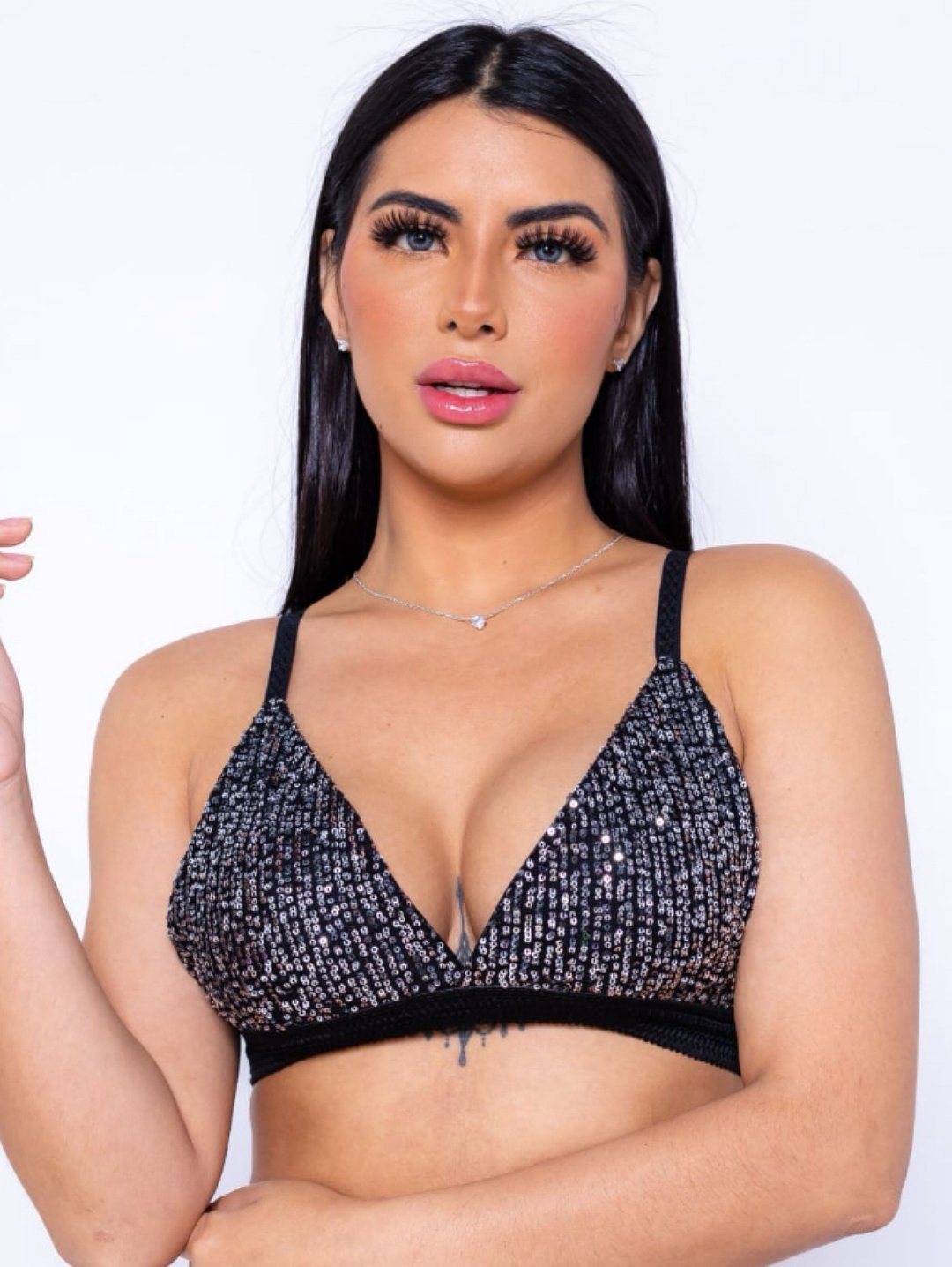 Este top é a escolha perfeita para quem deseja brilhar com estilo e elegância. Confeccionado em paetê de alta qualidade, ele garante um visual deslumbrante sem abrir mão do conforto. O modelo sem bojo proporciona um caimento natural, enquanto as alcinhas finas adicionam um toque de delicadeza ao look.