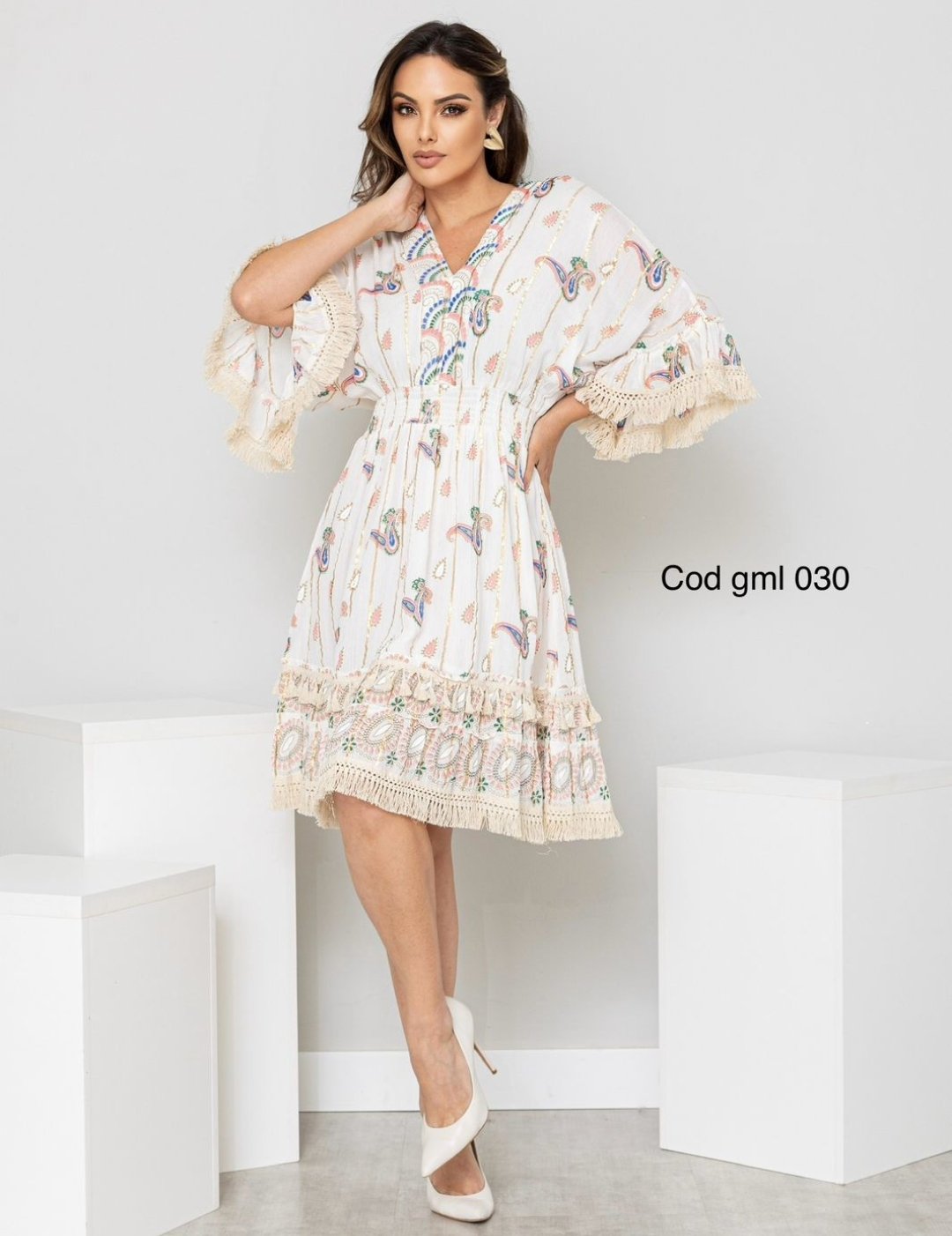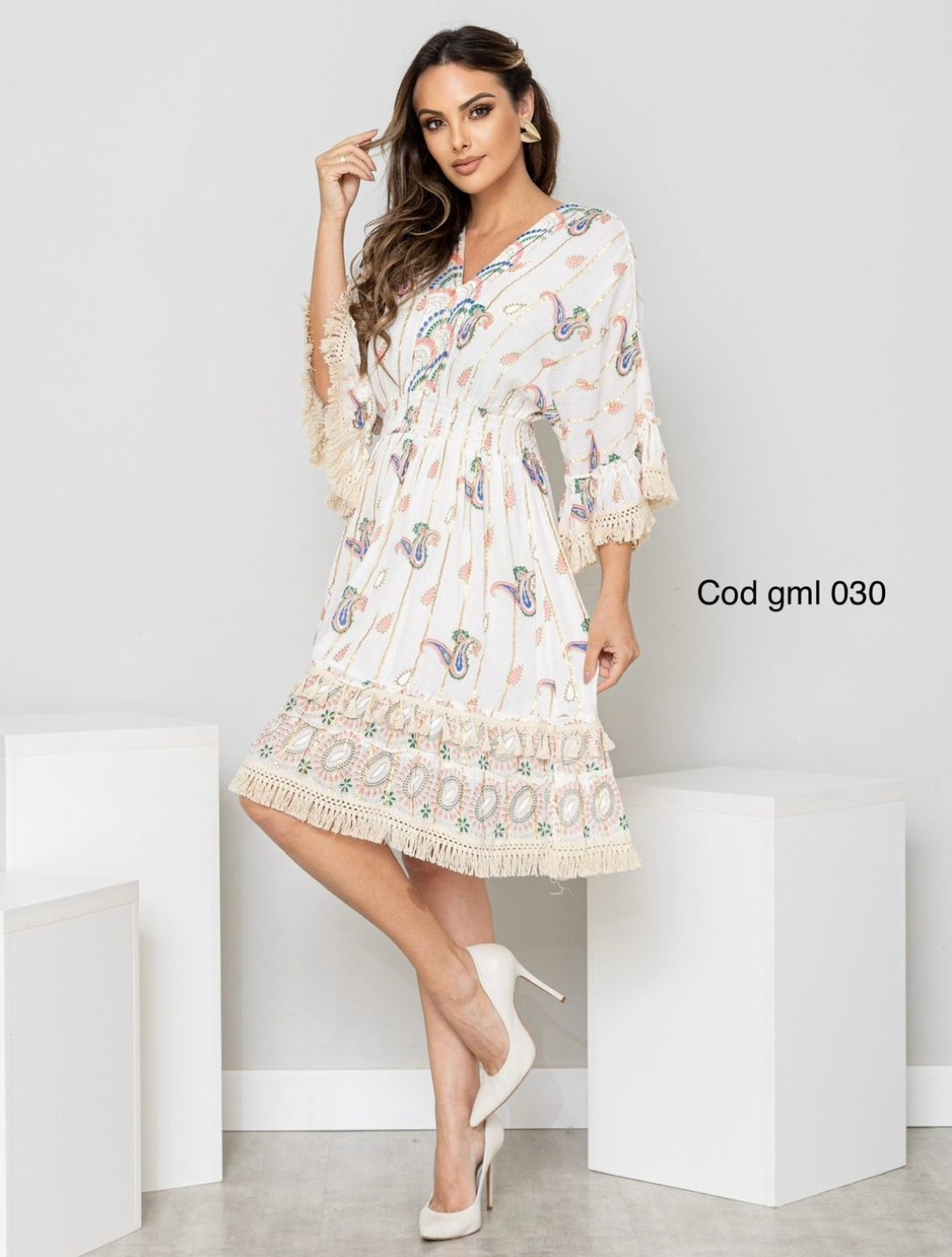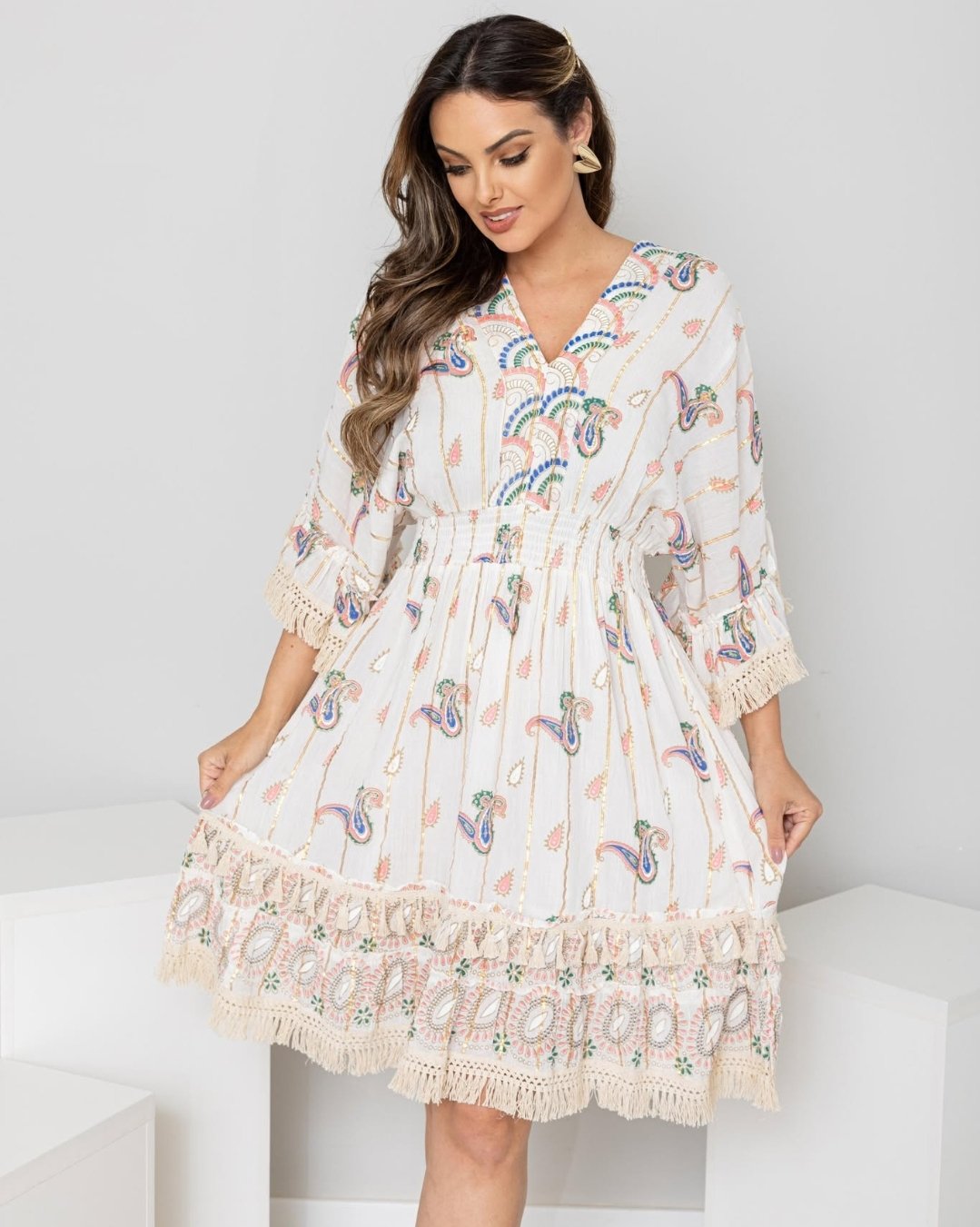 O Vestido Boho Luxe é a escolha perfeita para quem busca um visual sofisticado com um toque despojado. Com estampa paisley em tons suaves e detalhes bordados, essa peça traz leveza e charme para qualquer ocasião. Possui mangas flare com babados, decote em V detalhado e cintura ajustável para um caimento impecável. O barrado com franjas artesanais adiciona um toque romântico e exclusivo. Ideal para eventos diurnos, passeios ou até mesmo produções mais elegantes. Combine com acessórios delicados e arrase!