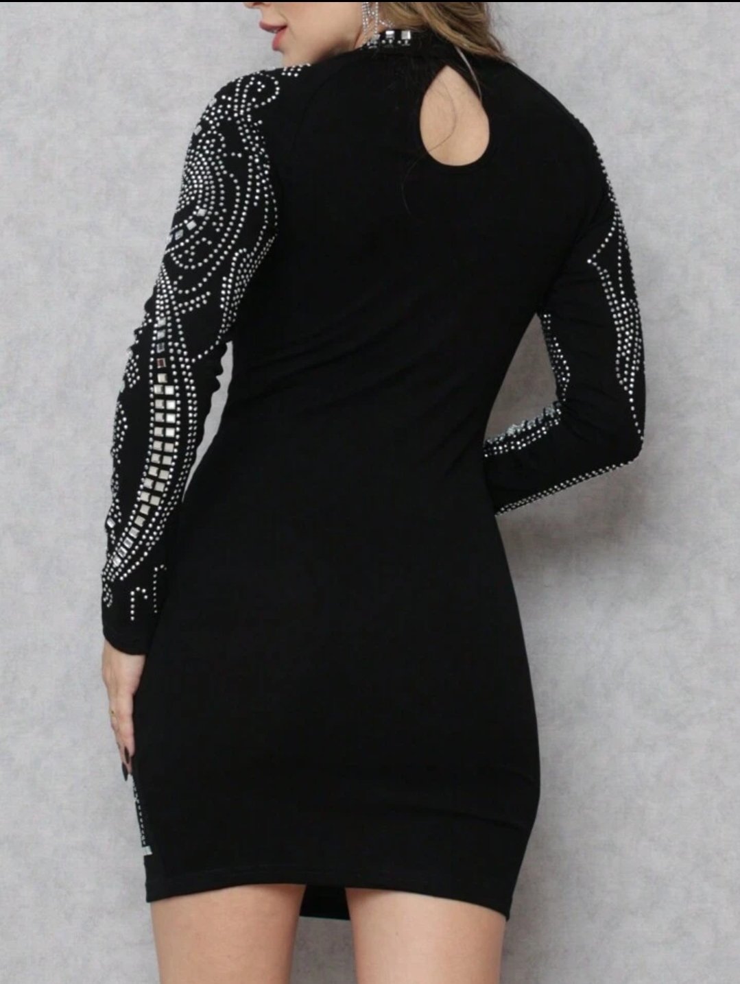 Os detalhes de aplicações brilhantes na frente, nas mangas e no recorte deste vestido são o destaque que eleva o visual, oferecendo um toque de glamour e sofisticação. Cada aplicação é cuidadosamente posicionada para criar um efeito visual impressionante.