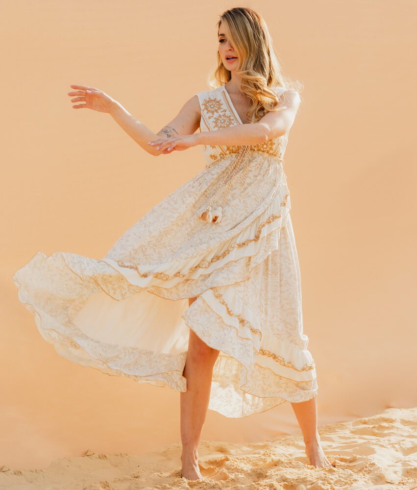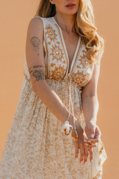 Descubra a elegância atemporal do Vestido Manisha, uma peça deslumbrante que combina o charme do estilo indiano com o requinte moderno. Feito com crepe de alta qualidade, este vestido longo apresenta um decote V delicado que realça a feminilidade. Cada centímetro é adornado com bordados feitos à mão, exibindo padrões intrincados que contam uma história de habilidade artesanal. O babado na saia adiciona um toque de romance, enquanto o caimento perfeito abraça as curvas de forma graciosa. Disponível em tamanho único, este vestido se ajusta perfeitamente aos tamanhos 38 ao 44, garantindo um visual elegante e confortável para todas as mulheres.